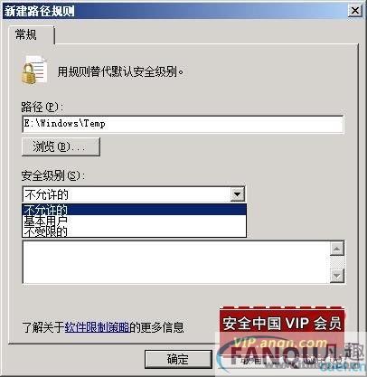 其次在该控制台窗口的左侧位置处,依次选中“计算机配置“/“Windows设置“/“安全设置“/“软件限制策略“/“其他规则“选项,同时用鼠标右键单击该选项,并执行快捷菜单中的“新建路径规则“命令,打开如图2所示的设置对话框;单击其中的“浏览“按钮,从弹出的文件选择对话框中,选中并导入Windows Server 2008系统的临时文件夹,同时再将“安全级别“参数设置为“不允许“,最后单击“确定“按钮保存好上述设置操作,这样一来网络病毒日后就不能躲藏到系统的临时文件夹中了。