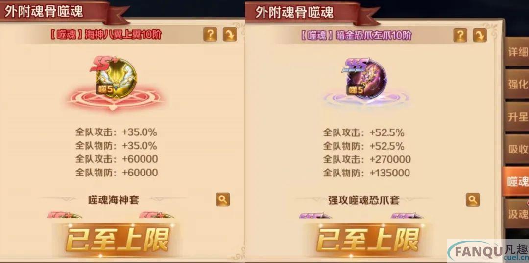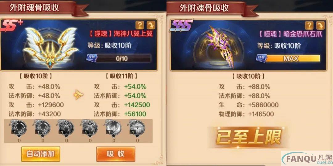 我们可以看到吸收有所改变,sss外骨吸收上限为10阶。吸收10阶由48%属性增长到了88%属性。且吸收增加攻击属性变为了吸收右爪。多了汲魂功能。sss外骨汲魂收益大于ss+吸收11-15阶。