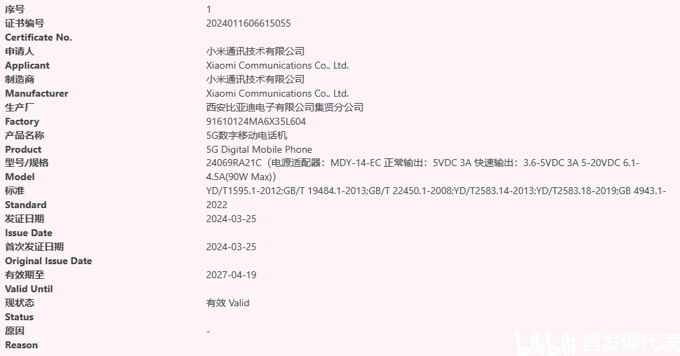 Redmi新机已通过国家3C质量认证,型号为24069RA21C,支持90W有线快速充电。