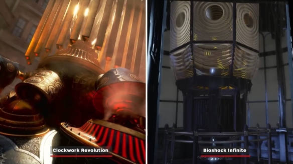 自从我们(IGN)在2023年的Xbox游戏展上第一次看到《发条革命》以来,网友们就注意到这款全新的蒸汽朋克游戏和广受好评的生化奇兵: Infinite有很多相似之处。为了好玩,我们决定拿《无限》和《发条革命》做比较,结果令人惊讶。