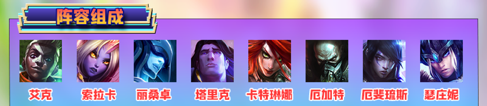 阵容以Ike和Ogat为主,以Katrina为工具挂能量圣杯,其他棋子多为羁绊,只有两星就够了,不用追三星。
