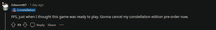 截图中,一位顾客坐在餐厅里,似乎正在享用一碗汤和一些太空零食。但是明明在喝汤里,却没有给他勺子。这导致很多玩家说:托德,勺子?没有沉浸感。取消预购,游戏不能玩了。