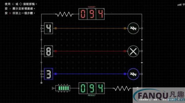 配电盘的电压小游戏很简单,只需要根据左右两边的数字相乘,相加,使下方数字跟上方对应即可,以图中为例,三个都连直线后下方数字跟上方数字相等,即可破译。