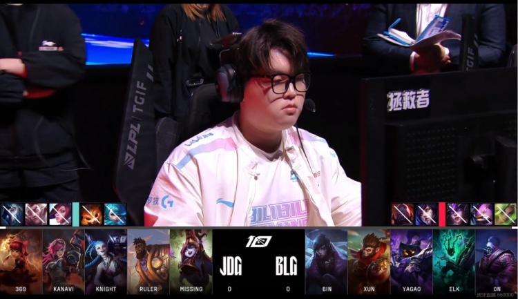JDG:上单369,大业卡那维,钟丹骑士,夏禄统治者,辅助失踪。