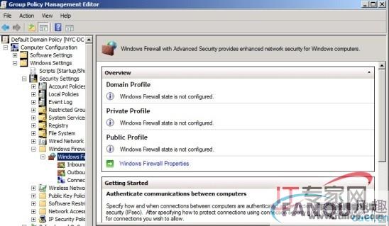 点击“开始“在搜索栏中输入“gpmc.msc“打开GPMC的组策略管理工具。依次展开DC域定位到本域的“默认域策略“位置,双击选中该项然后依次点击“Action“→“Edit“进入域策略的编辑窗口。依次点击“Computer Configuration“→“Windows Settings“→“Security Settings“→“Windows Firewall with Advanced Security“,双击打开“Windows Firewall Properties“可以在右侧看到防火墙策略的预览,从中可以了解“Domain Profile“、“Private Profile“、“Public Profile“的配置状态。(图1)