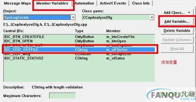 2、将打开的新窗口切换至“MemberVariables”标签下,在列表中选中如图所示的这一栏,然后点击右侧的“AddVariable…”按钮添加变量。最后在需要值的函数里面,调用UpdateData(),这时刚刚指定的变量就变成编辑框中的值了。