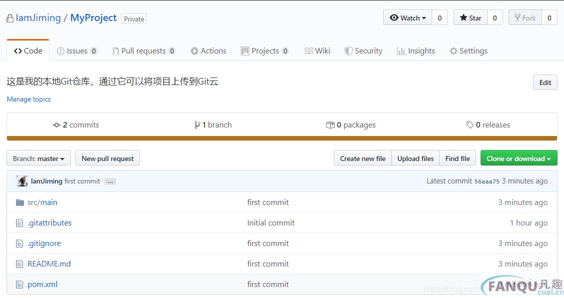 登录我们的git官网,在我的仓库中就会出现刚刚提交的项目,它创建了一个同名的仓库。