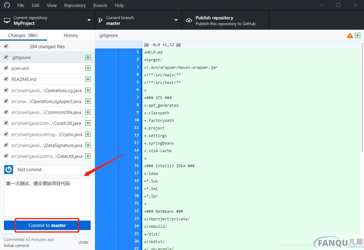 然后我们在回到GitHub Desktop上,可以看到新增代码都展示在这里,我们需要先提交到本地仓库,如图操作: