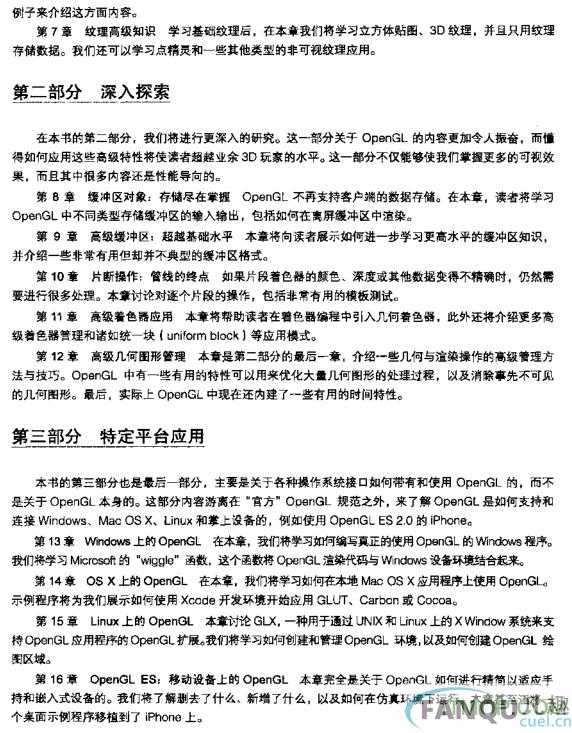 第三部分包括第13章到第16章,着重介绍OpenGL如何支持和连接Windows、MacOSX、Linux和掌上设备。附录部分给出了更多阅读建议、术语表和API参考介绍。